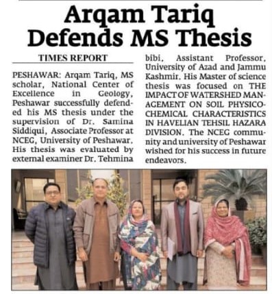 Peshawar December 12, 2025. Mr. Arqam Tariq, MS scholar, National Center of Excellence in Geology, Peshawar successfully defended his MS thesis under the supervision of Dr. Samina Siddiqui, Associate Professor at NCEG, University of Peshawar. His thesis was evaluated by external examiner Dr. Tehmina bibi, Assistant Professor, University of Azad and Jammu Kashmir. His Master of science thesis was focused on THE IMPACT OF WATERSHED MANAGEMENT ON SOIL PHYSICOCHEMICAL CHARACTERISTICS IN HAVELIAN TEHSIL HAZARA DIVISION.