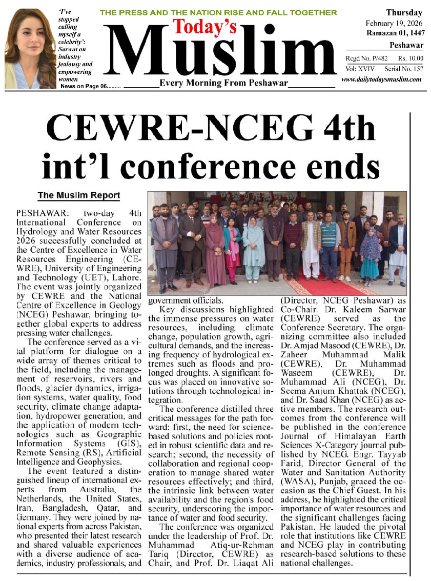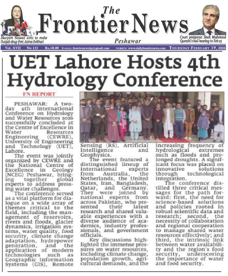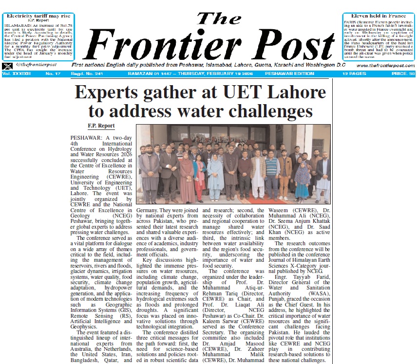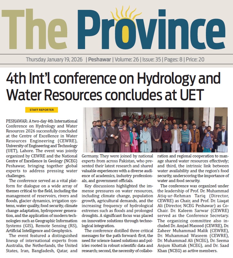 CEWRE-NCEG 4th International Conference on Hydrology and Water Resources Concludes, Urging Science-Based Solutions for Water Security. The two-day 4th International Conference on Hydrology and Water Resources 2026 successfully concluded at the Centre of Excellence in Water Resources Engineering (CEWRE), University of Engineering and Technology (UET), Lahore. The event was jointly organized by CEWRE and the National Centre of Excellence in Geology (NCEG), bringing together global experts to address pressing water challenges.